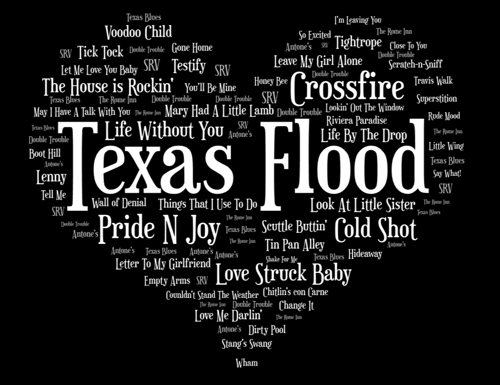 This is the SRV Song WordArt in the shape of a Heart I made to put on a T-shirt so I can wear it the next time I got to take folks to visit the Rock Hall in Cleveland. This one is one great for the gals, while I also have one in the works for the guys shaped like the state Stevie Ray was also happy to get home to, TEXAS.